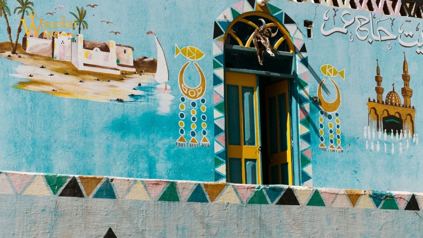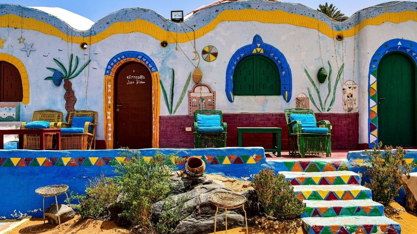 One of the first things many people notice around Aswan is how colourful some Nubian areas look. You might see houses painted in strong blues, yellows, oranges, and greens. You’ll also spot patterns on walls, painted door frames, and little details that feel cheerful and personal.